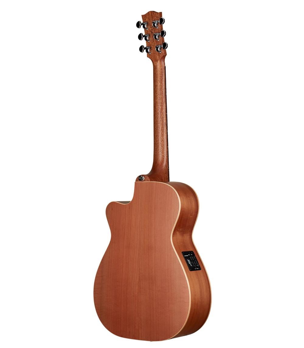 Die massive Fichtendecke sorgt für eine brillante Ansprache und exzellente Dynamik. Boden und Zargen aus Tasmanian Myrtle liefern eine warme, ausgewogene Resonanz mit kräftigen Mitten und satten Bässen. Der massive Mahagoni-Hals bietet eine optimale Schwingungsübertragung und ein angenehmes Spielgefühl.